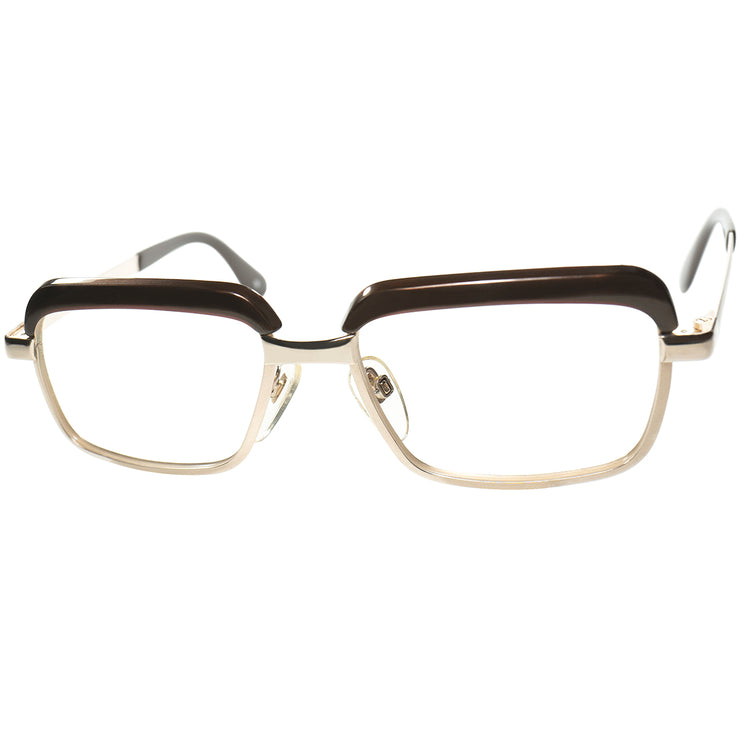 しっかりと厚みのある一文字のブローラインにやや短めな縦幅の長方形のレンズ枠を採用し、リムには金張の素材をマットとポリッシュをそれぞれ風合いを変えてコントラストつけ、リムは幅広気味にとられていたりと、