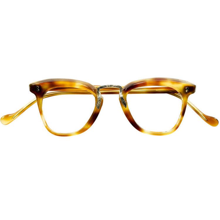 ティアドロップに似た独特の尻すぼみなレンズシェイプにはじまり、OLD FRENCHのお家芸であるフロントブローラインの傾斜カッティングや、横から見た際に一直線に見え、着用時に無機質な印象を醸し出すフラットフロントなど黄金期とも呼ばれる所以のハイレベルなディテールが散見する芸術的仕上がりの1本です。