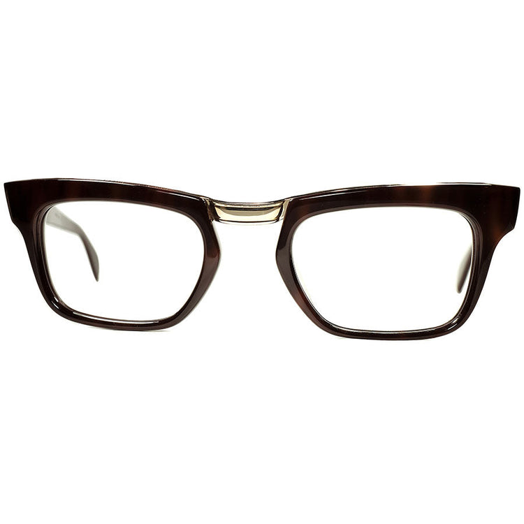 大陸系のヨーロッパヴィンテージらしいダークなデミ生地を基調とし、さりげなくアクセントとしてブリッジ部分のみに本金張りを採用した絶妙なセンスの良さを感じさせる佇まいに仕上がっております。