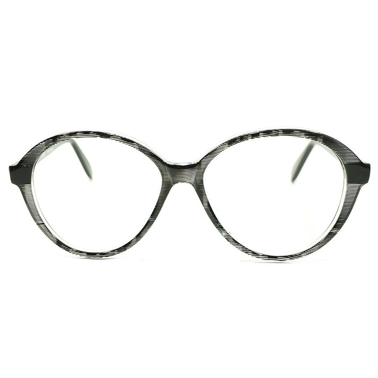 コレクタブルでディープすぎるフレームを作っていた同メーカーとしてはかなり落ち着いたデザインですが、それでも1980年代らしい細かなモザイク柄ボーダーとブラックとのモダンな2トーン仕様や、それ以前とは一線を画すサイズバランスが80sらしさを伝え残す面白みのある1本です。