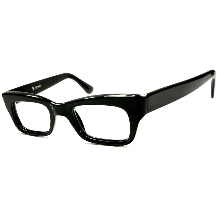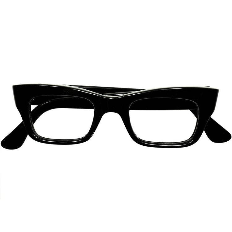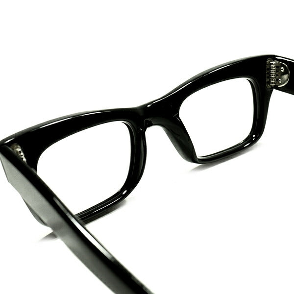 一切の装飾を排除したストイックなまでにミニマルなルックスに、黒光りする艶感が凄まじい固く上質なセル生地を用いた1960年代製造の英国製ウェリントンフレームになります。