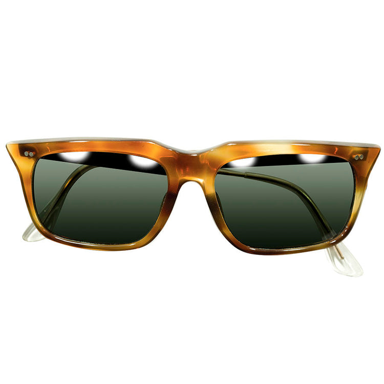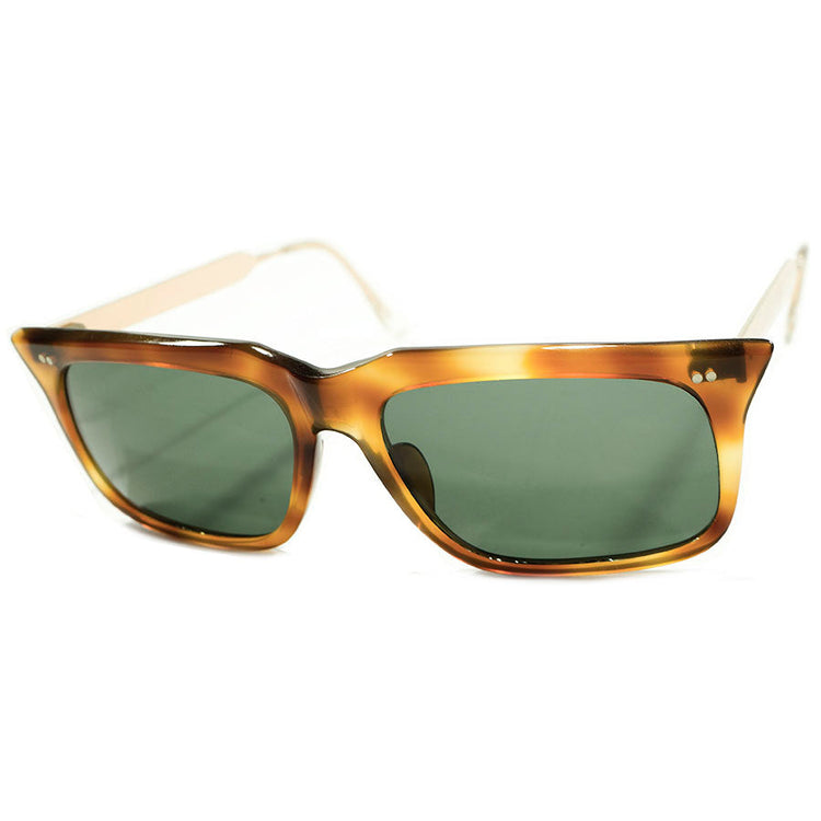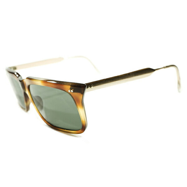 両サイドの角を残しエッジを効かせたウェリントンシェイプに、フロントからは想像もつかないゴールドメタルのテンプルを配した大胆なコンビネーションが取り入れられており、当初よりファッション的志向で作られたことが窺える、ガラスレンズ入サングラス仕様のハイデザインな1本です。