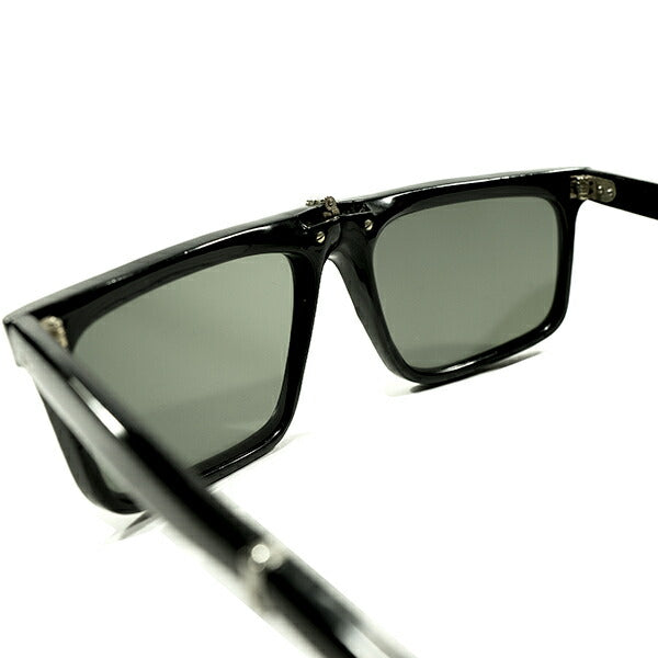 直線的なブローラインや無機質な幾何学系ウェリントンシェイプが何処かインテリジェンスで高度に洗練されたMODEな世界観を表現しているようで、フロントヒンジすらもないソリッドブラックに、オリジナルのグレー系ガラスレンズがインストールされた遠目ALL BLACKのスマートでクールな表情には非の打ち所がありません。