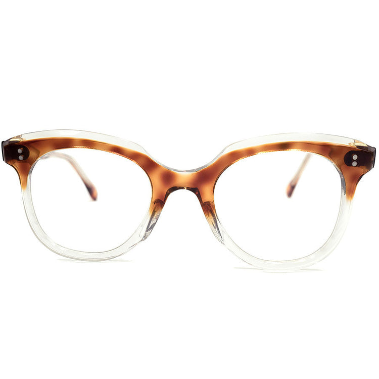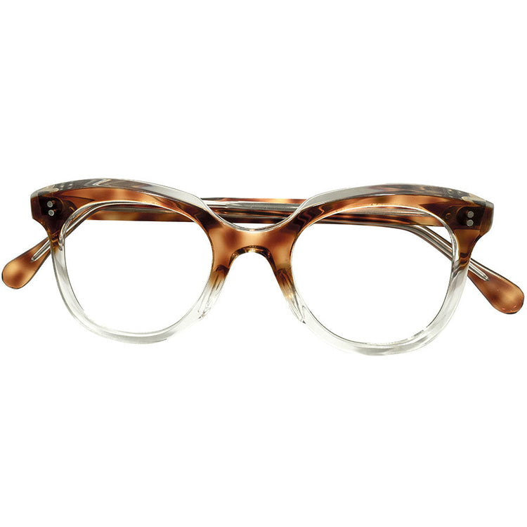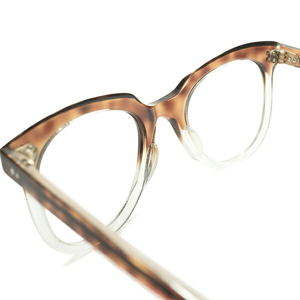 この時代ヨーロッパでは英国とフランスの一部フレームのみに見られたブロー部分を斜めにカッティングする事によって独特な奥行きを生み出した傾斜カットと、ややエッジを効かせたウェリントン型パントシェイプを組み合わせた高度な造形を披露する仕上がりになり、クリアボディをベースに表面のみにAMBER FADEを乗せた透明度が高く美しいカラー使いは、まるでレイヤードしたかのように傾斜部分にクリアカラーが顔を覗く完成度の高い仕上がりになります。