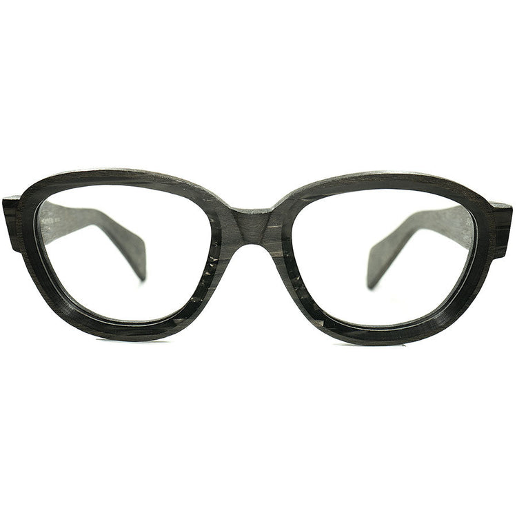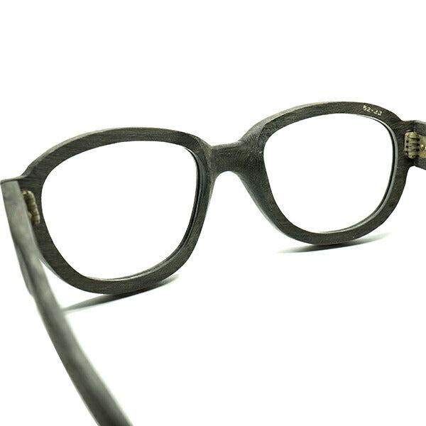 一点一点ハンドメイドで丁寧に成形されたことが伝わってくる表面の質感が温かみがあり、まるで何十年もの時を経たようなアンティークウッドのような風合いがリアルに表現されているその様は、ビンテージ眼鏡に最も精通する我々ですら本物のウッドと間違えてしまう程、完成度の高い仕上がりとなっております。