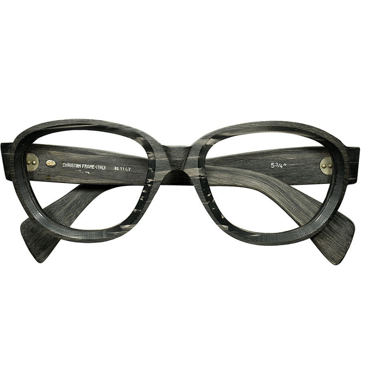 生地の表面に非常に繊細な木の繊維のように凹凸をつけることにより、まるで本物の枯れたアンティークウッドのような質感を忠実に再現し、さらにこの時代のヴィンテージディティールでは大技の一つであるブラウン管のようにレンズ枠をカットする製法であるテレビジョンカットを採用した、妙技同士のコンビネーション技が見事すぎる芸術的完成度のイタリアンビンテージからの驚愕の一本が入荷しました。