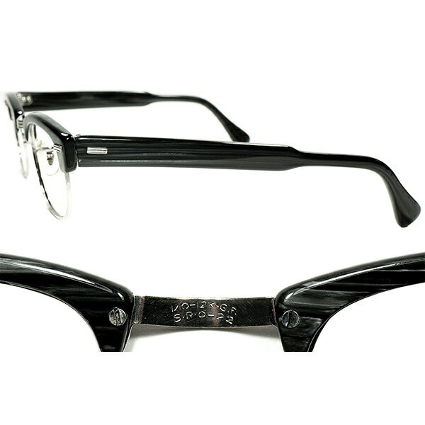 SROが同じく力を入れていたブロータイプであるDOBBSシリーズはシュロンの名作RONSIRを意識した作りが見られるものの、こちらはDOBBSとは完全に異なる趣向を目指しており、 USブロータイプ全般でもかなり珍しい縦幅を大幅に抑えた横長のコンパクトフォルムと、ヴィンテージメガネ好き、古着好きから絶大な支持を受けるブラックウッド柄とのミッドセンチュリーらしいのコンビネーションは、まさに新感覚で玄人好みなクラシックと捉えて頂けるのではないでしょうか。