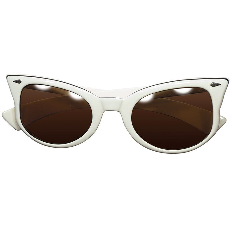 アメリカ黄金期の象徴であるダイヤヒンジがあしらわれ、当時でも珍しいアイボリーのセル生地には厚み部分にアクセントになるようブラックのパイピングが施されたモノトーン仕様、