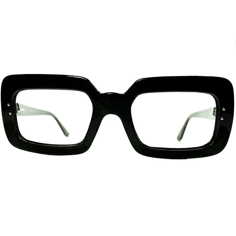 眼鏡、サングラスの両方で使える秀逸なシルエットバランスの幅広なスクエアリムが どこか怪しげで不気味な表情を演出するその様相は当時のフレンチモードそのものと言えるほど