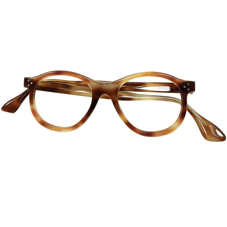 古い時代のFRAME FRANCEでは定番の顔馴染みに定評のあるアンバー生地を採用した6mmの肉厚フロントに、3ドットヒンジが堂々と鎮座しながらも、嫌味のないどこか愛くるしさを感じさせるNERDなシェイプが、