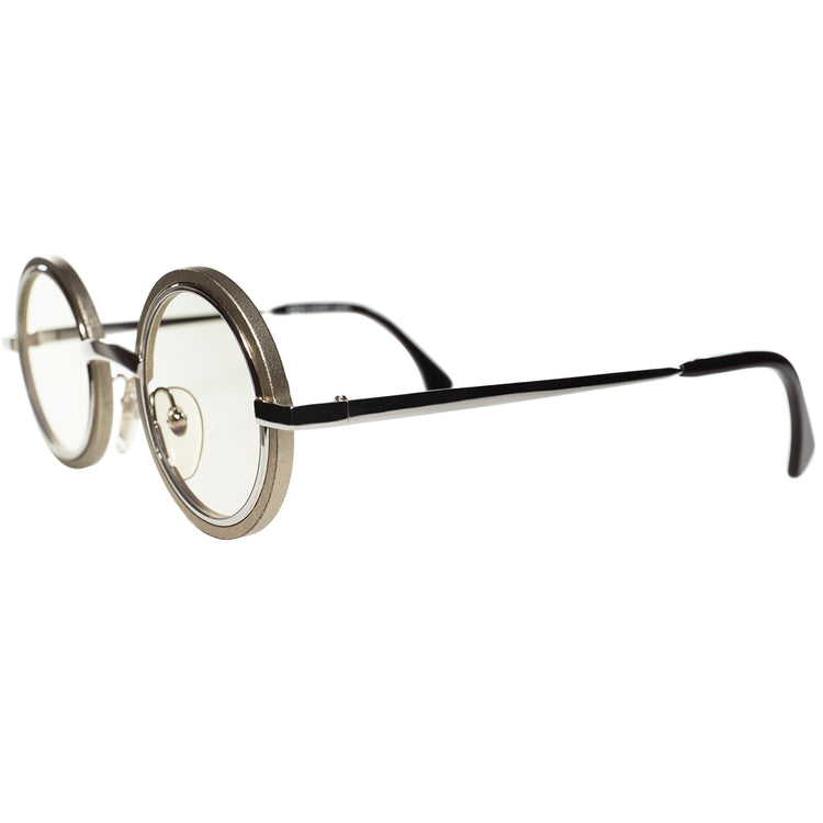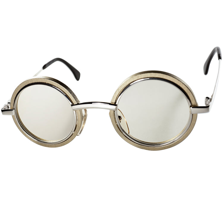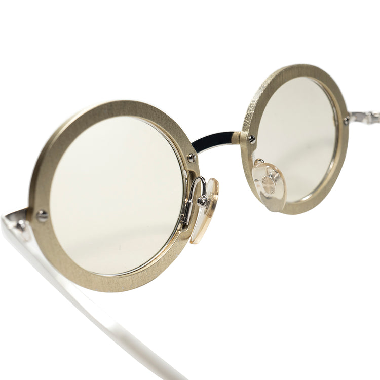 無機質で工業的なシルバーメタルをベースに、レンズ枠周りにはそれとは対象的な質感の無造作な色むらのある塗装や、表面の荒れ、