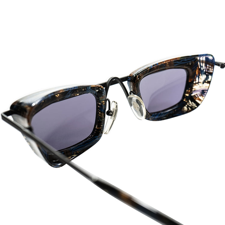直線的で無機質なこの字型のメタルバーに、ARTYなアブストラクトパターンのセル生地を使用したウェリントン型のレンズシェイプのセル枠がぶら下がっており、