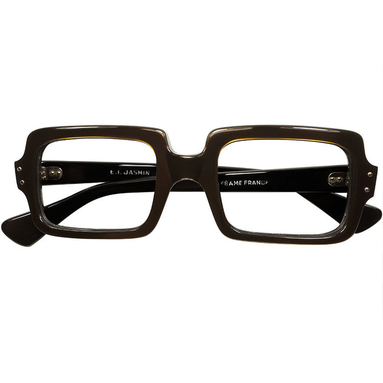 BLACKのベースボディの表面にいかにもミッドセンチュリー期らしいGLOSSYなブラウンの生地を張り合わせたレトロ感全開の配色があたり一面に漂うレクタングル(長方形)フレームがまっさらな最高ランクのデッドストックで入荷しました。