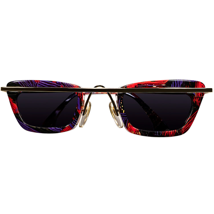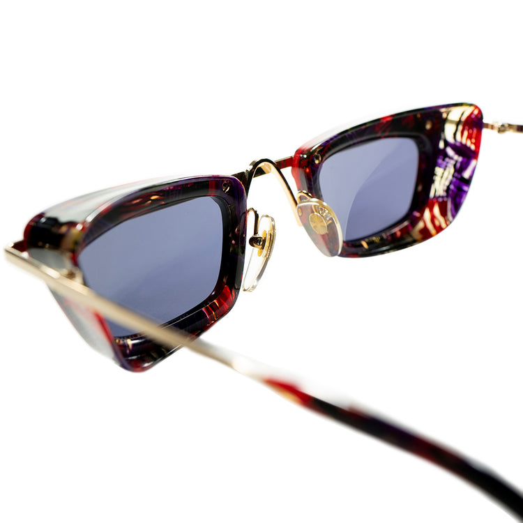 直線的で無機質なこの字型のメタルバーに、ARTYなアブストラクトパターンのセル生地を使用したウェリントン型のレンズシェイプのセル枠がぶら下がっており、