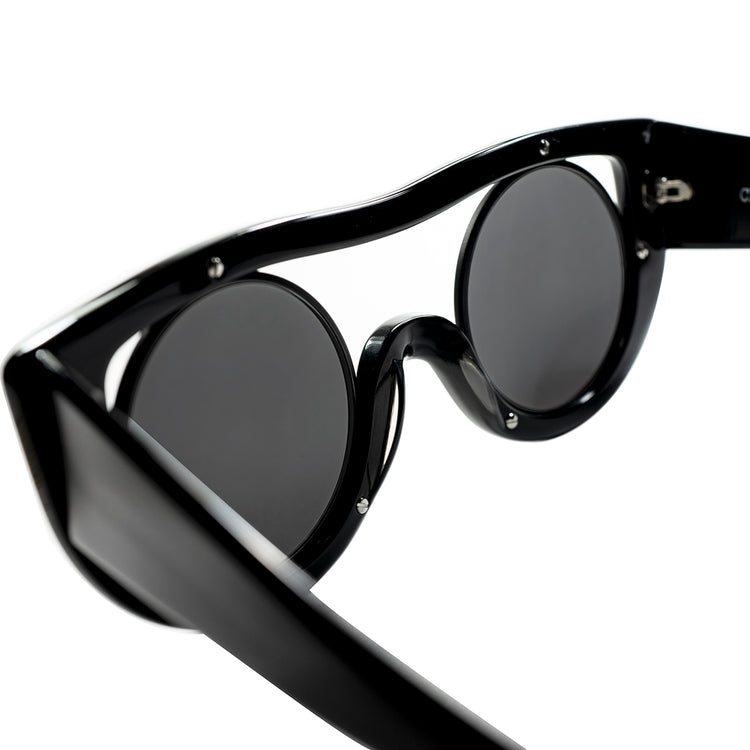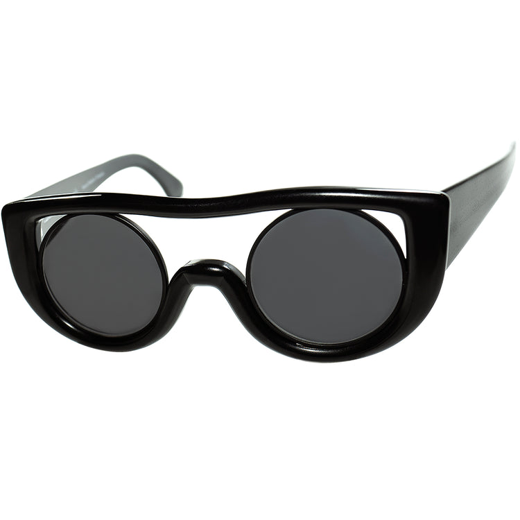 ウェリントン型の一本繋ぎのセル枠の中にまん丸のラウンドのメタルのレンズ枠を嵌め込むというダイナミックで複雑、そしてシュールなモードデザインが超衝撃的で一度見ると脳裏に焼き付いて離れない、