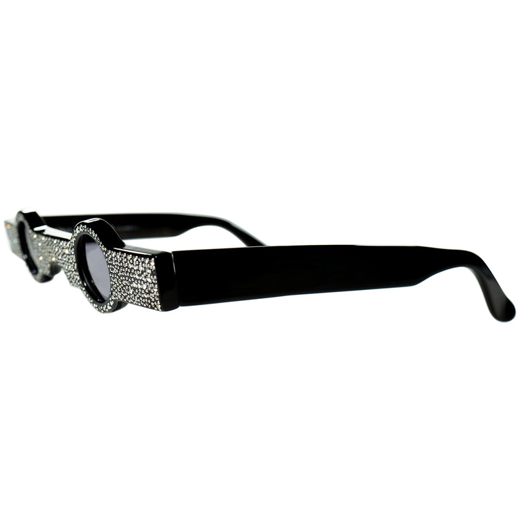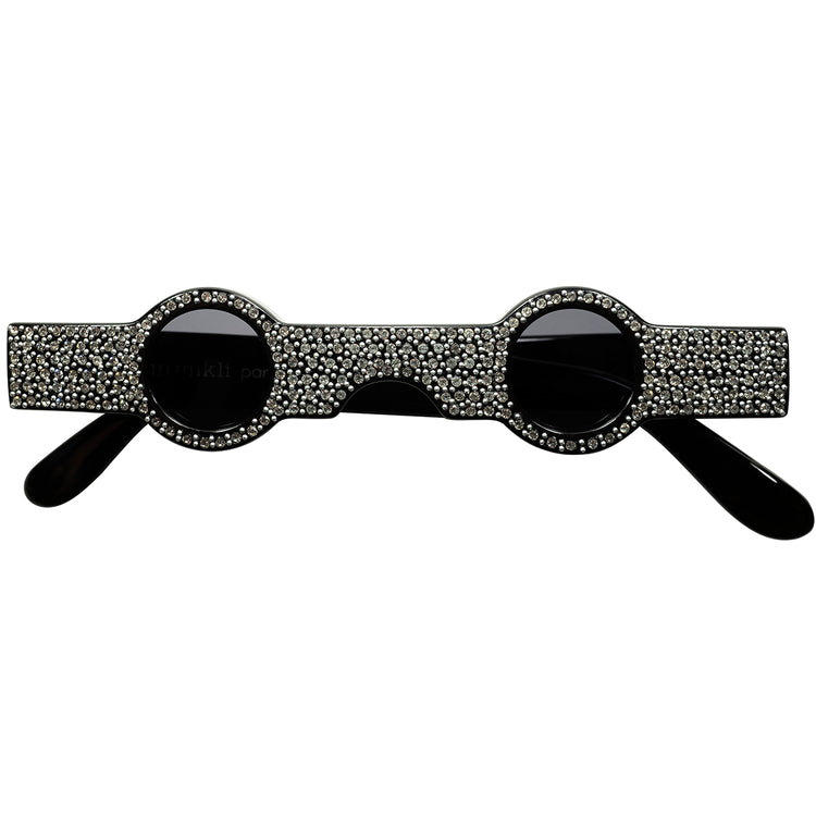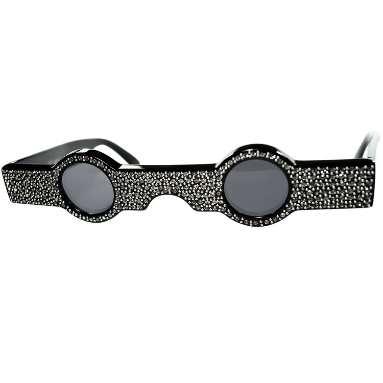 浮世離れした丸眼鏡シェイプの上からレンズ枠周りにのみラインストーンを施すという、