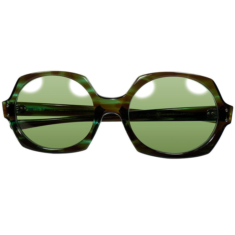 この時代の当時のUSの時代背景を反映しているかのような、サイケデリックな雰囲気すらも漂う良い意味で毒毒しさがたまらないグリーントータス生地に大判なHEXGON シェイプが当時のヒッピームーブメントを想起させる仕上がりとなっており、