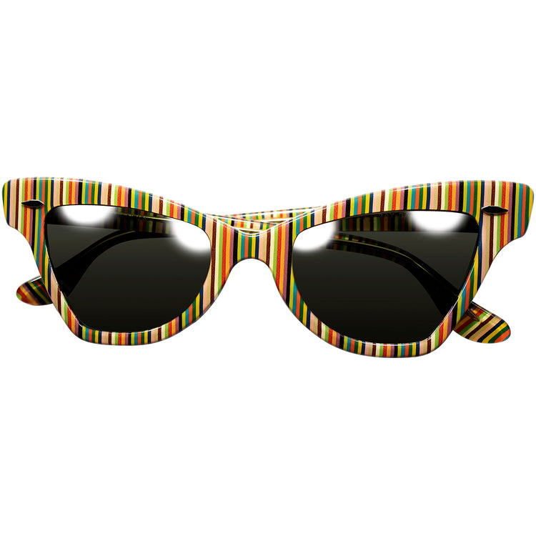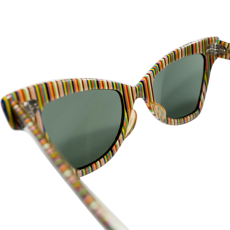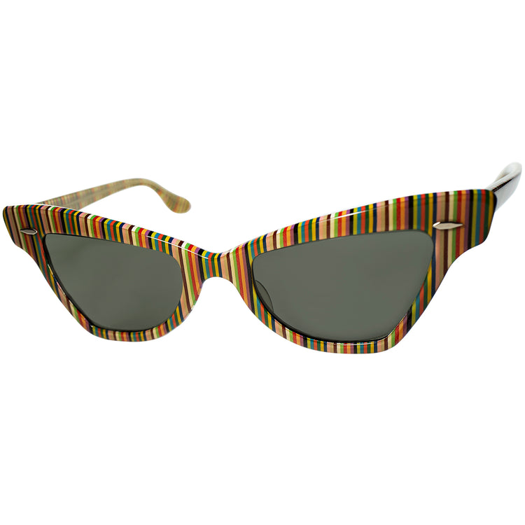 ミッドセンチュリーアメリカンを象徴するアブストラクトなマルチストタイプをフレーム全面に落とし込んだART作品のようなキャットアイサングラスがまっさらな最高ランクの正真正銘デッドストックで衝撃登場となります。