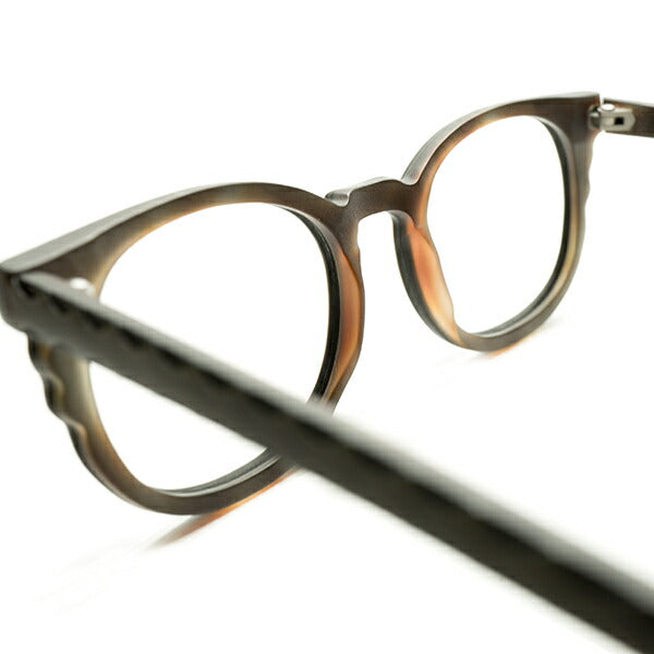 インナーにブラウン、そしてMATT ANBERを挟んだ3層レイヤード生地を使いは角度によってはチラッと見え、おたまじゃくし型のテンプルエンドを含めて効果的なアクセントを持つハイデザインな仕上がりは必見です。
