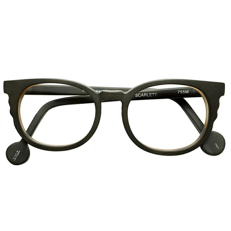 コロンと丸みを持つベーシックなウェリントンシェイプで仕上げた反面、凹凸を付けたカッティングをフロント一部またテンプルに採用する事で、
