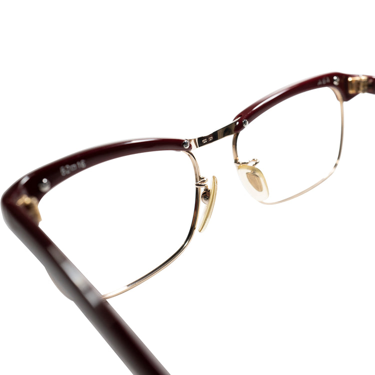 そこに現代のアイウェアでは絶対にしないような、シックで品の良い透明系ではないソリッドなボルドー生地に金張のゴールドという