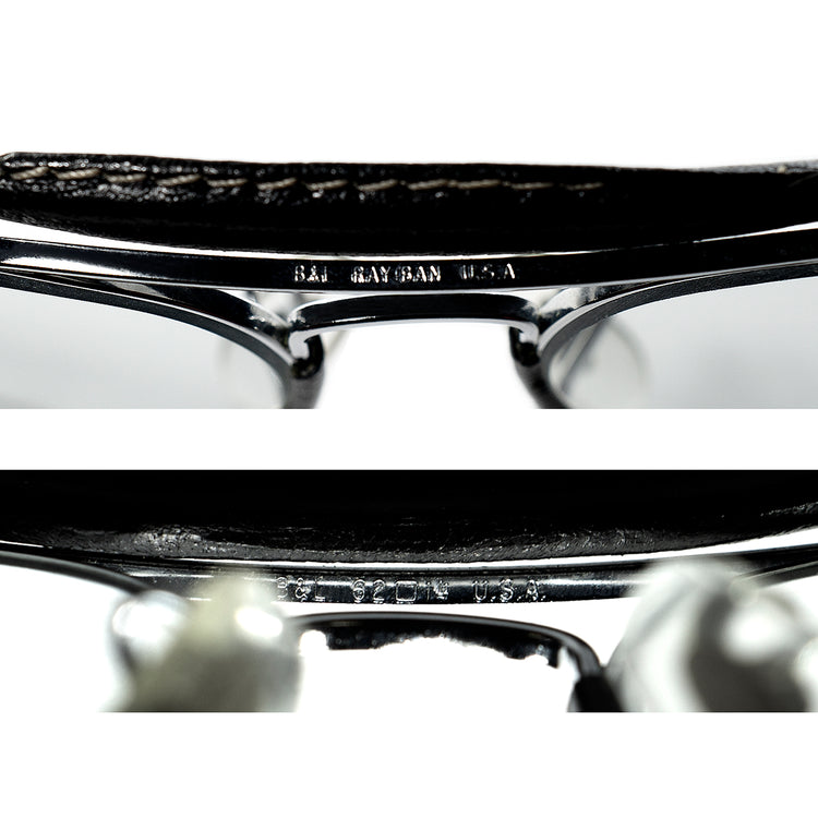 近年一般的に出回っているUSA製の個体のほとんどがGOLD METAL x BROWNレザーのものがほとんどで、レンズには白色のRAYBANロゴのプリントが入ってしまうものがその大半なのですが、