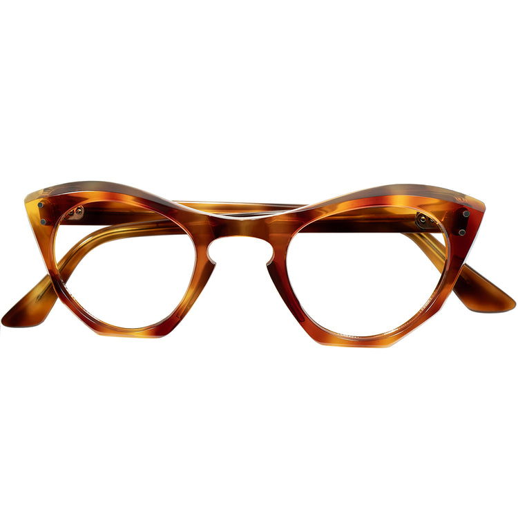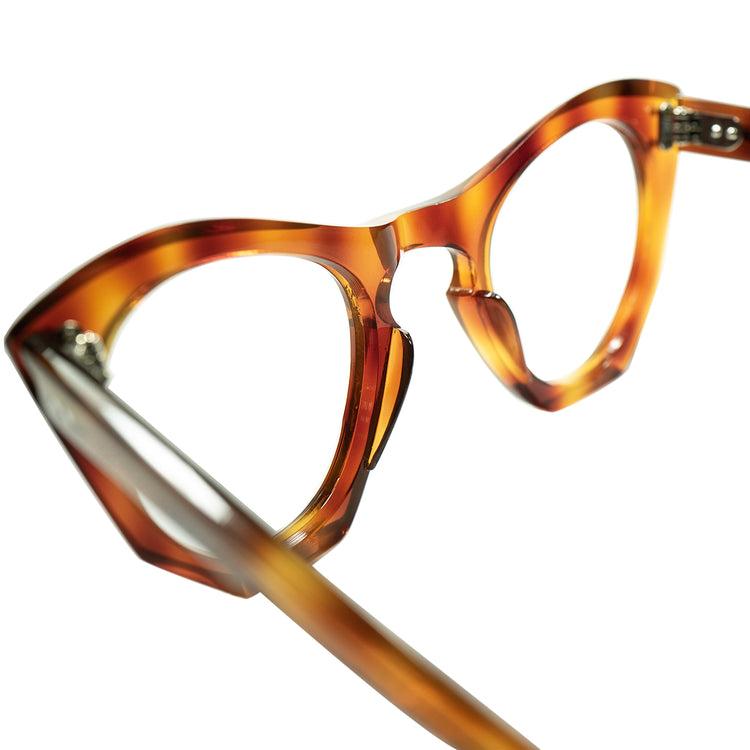 美しい流線形の眉ラインに奥行きをつけたカッティングや、フレームのボトム部分を角角しい形状に仕上げたりと、