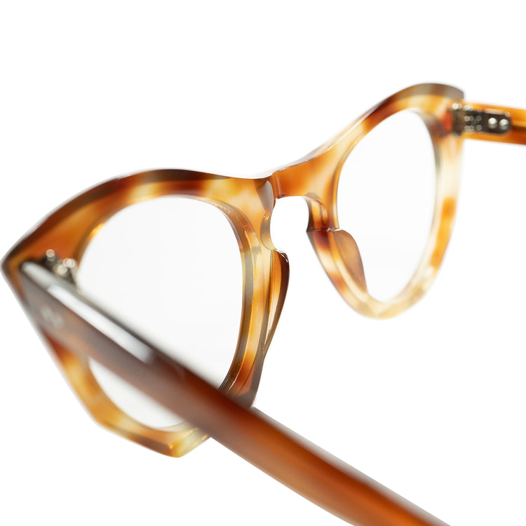 美しい流線形の眉ラインに奥行きをつけたカッティングや、フレームのボトム部分を角角しい形状に仕上げたりと、