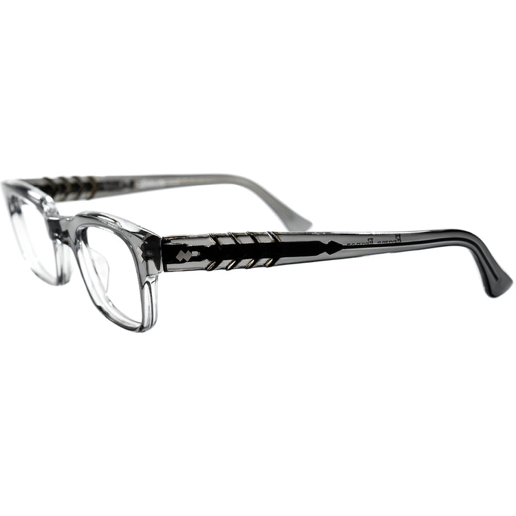 現代ではいわゆるウェリントン型と呼ばれるフレームシェイプのまるでお手本のような正統派ウェリントンシェイプともいえる佇まいやシェイプに、ヒンジには幾何学調のWダイヤ鋲があしらわれており、
