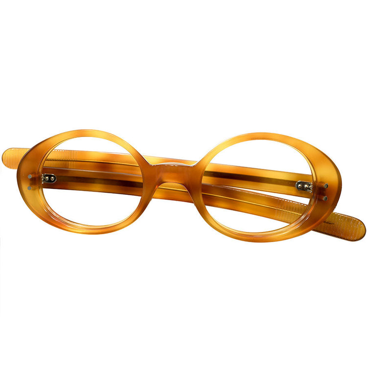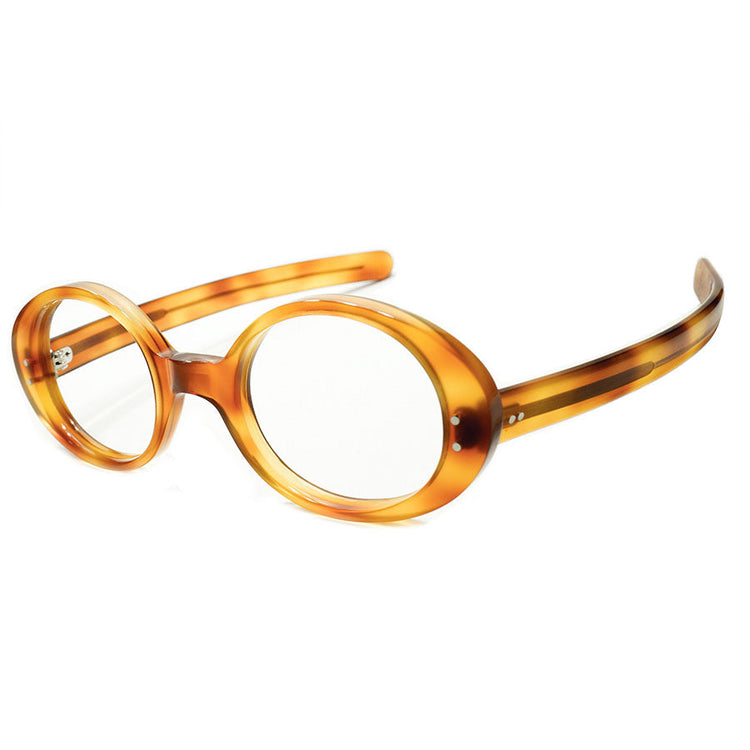 角を残し5~6mm程の厚みで仕立てられ曲線に強弱を付ける事で、美しい造形を魅せるオーバル型シェイプに組み合わす太さがほぼ均一なストレートテンプルは、寸分の狂いがないほどオリジナルMilinaireと同一の仕様が見られ、