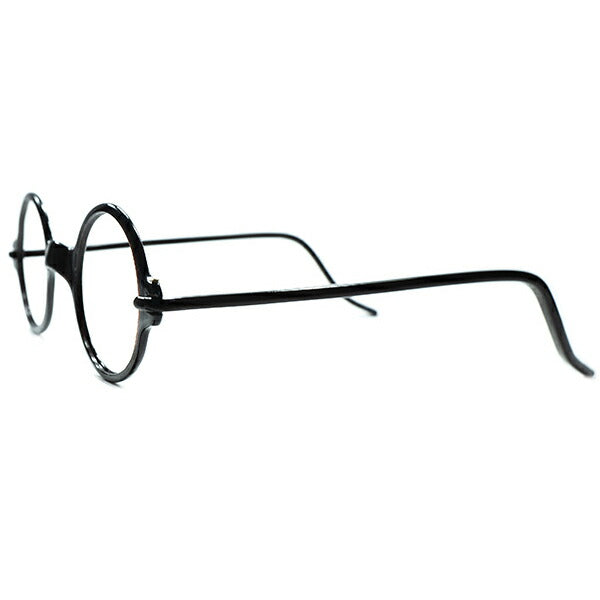 同年代のフランスのセルロイドラウンドにも見られるネジ代わりの極細のピン指しや、芯なしのオールドスタイルのテンプル形状、テンプルエンドのフィニッシュ形状など、技術的に発展途上であったことが伺える、この時代ならではのオールドディテールが散見する大変貴重な1本となっております。
