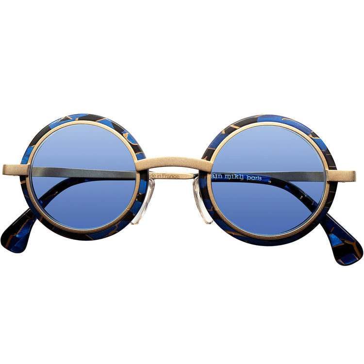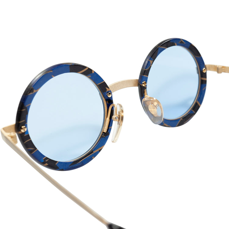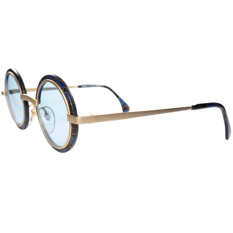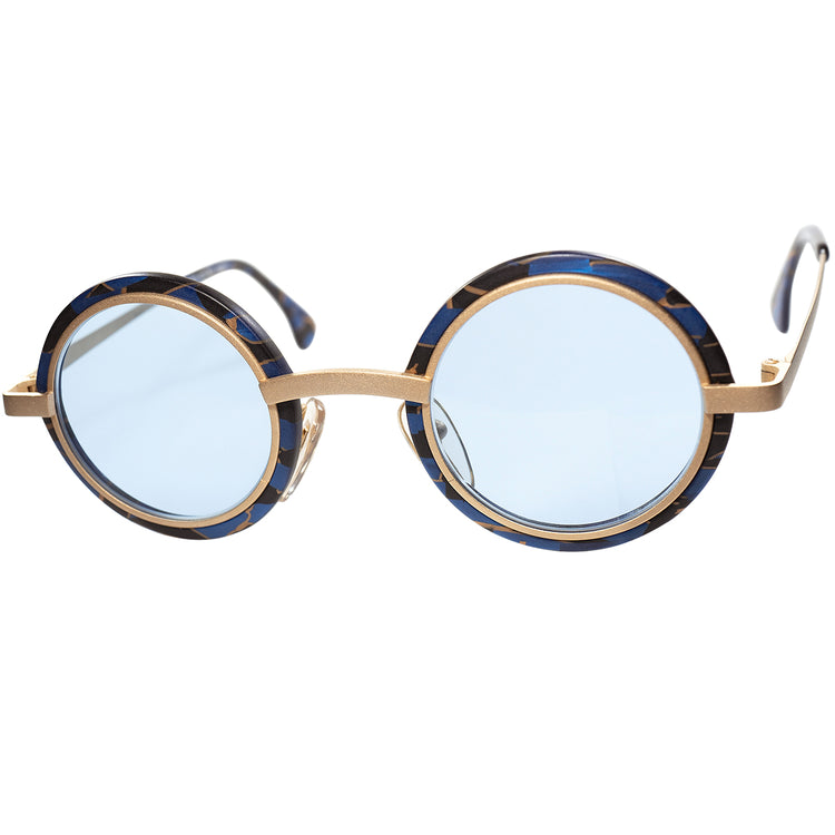 レンズ枠周りにはブルーを基調としBLACKとGOLDの指しが入る天然石をイメージしたかのようなパターンのセル生地が採用され両者が同じ方向を目指すことで、