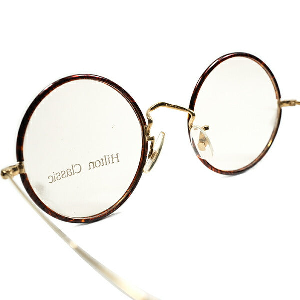 CLASSICなまん丸の正円のレンズ枠に、ダークトーンのデミ生地のHILTON純正のセル巻き、クリングスパッド、縄手ではないスタンダード仕様のテンプルと、